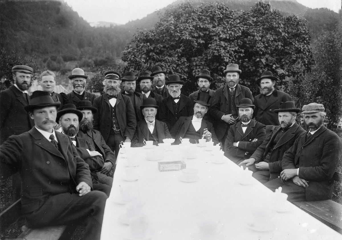 Frå venstre ståande bak bordet: hotelleigar Ivar Monsen, Pauline Monsen, Sjur L. Tyssen, lensmann Brynjulf Mugaas, Anders Langeland, Gulleik L. Langeland, Lars Mæland, lærar og kyrkjesongar Peder Mugaas, Gulleik O. Brekkhus, Olav Mykkeltveit og Askjell Brunborg.